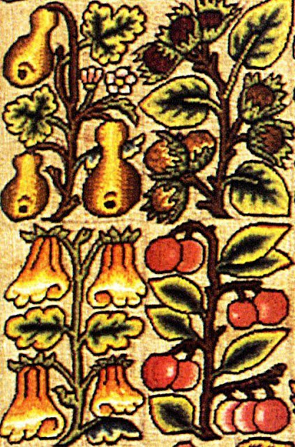 I have no idea what most of these flowers and fruits were meant to be, but I don't think it really matters. It is written that they used whatever colors they wanted, not necessarily the color(s) God intended.