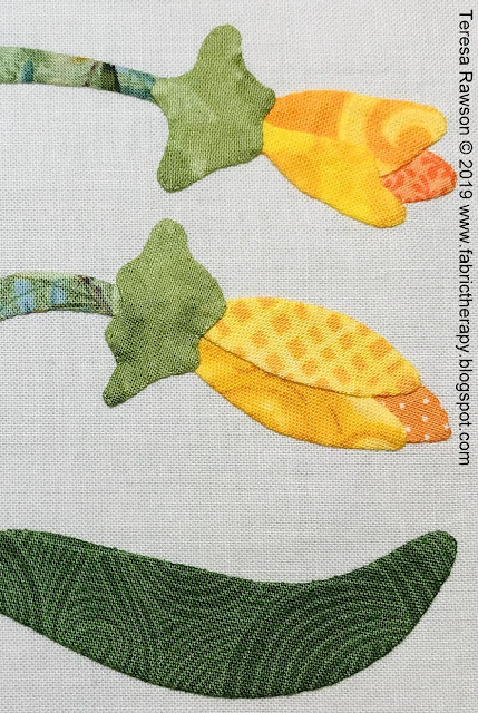 Some of my blocks will have reverse-appliqued leaves, like below. They can be worked with the centers appliqued "on top," or even as a solid leaf if wished.