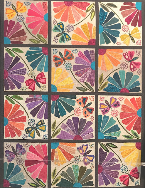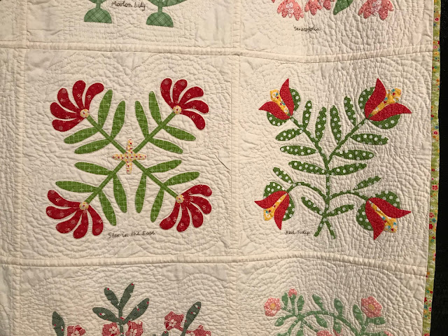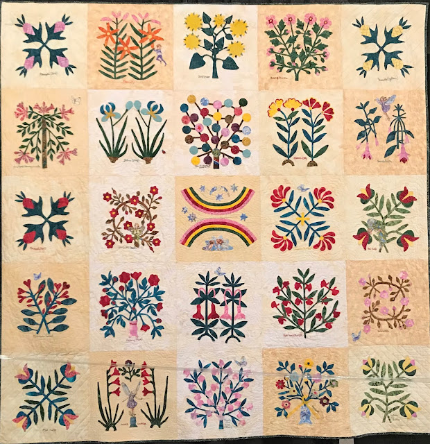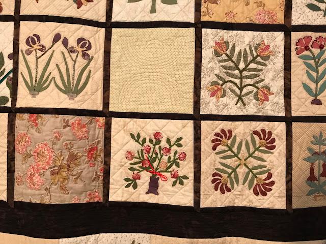 I have to admit that I have taken some liberties with my block colors as compared to the original sampler. One problem...blue is my favorite color. True blue flowers are not as plentiful as other colors.