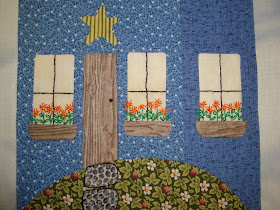 I'm making baby step progress on the 10th block of my "All Around the Town" by Sue Garmon.  I've appliqued aspects of the house, but still need to applique it to the background.  I went a little nuts and added window box gardens with embroidered Marigolds and a cobblestone sidewalk.