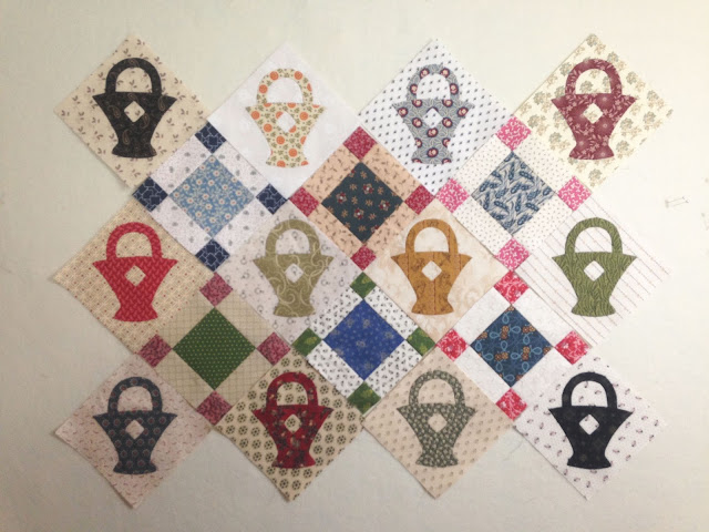 OK, I also took along a long-term, insane project with me based on a Blackbird Design quilt employing these tiny hand-appliqued basket blocks (finishing 5-inches). I showed you the following picture before I left...